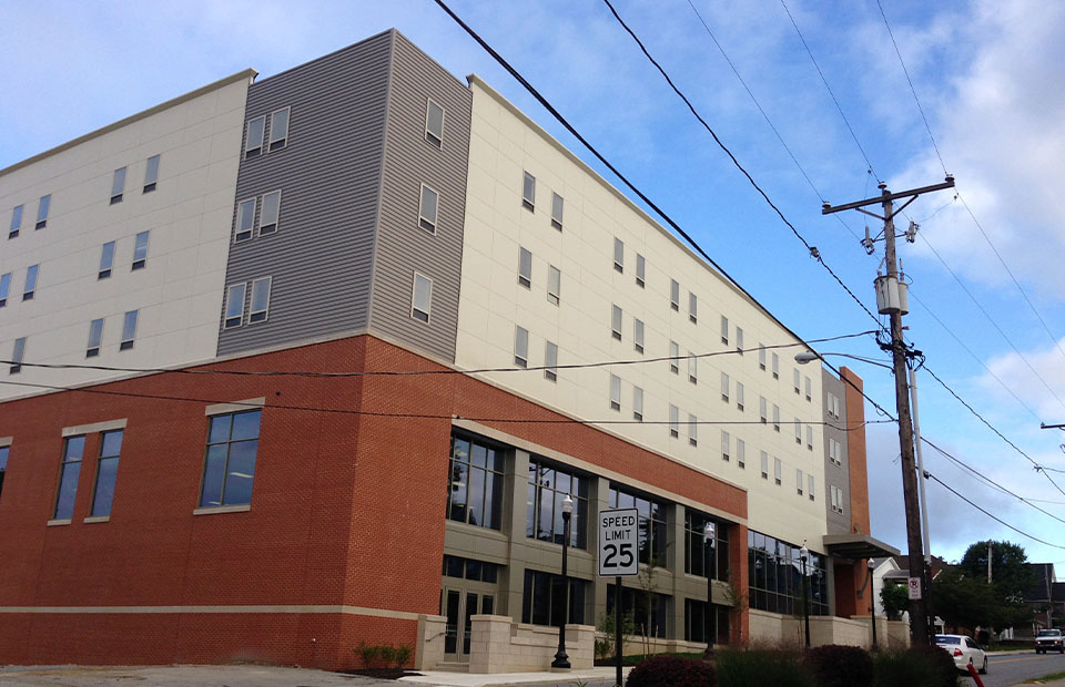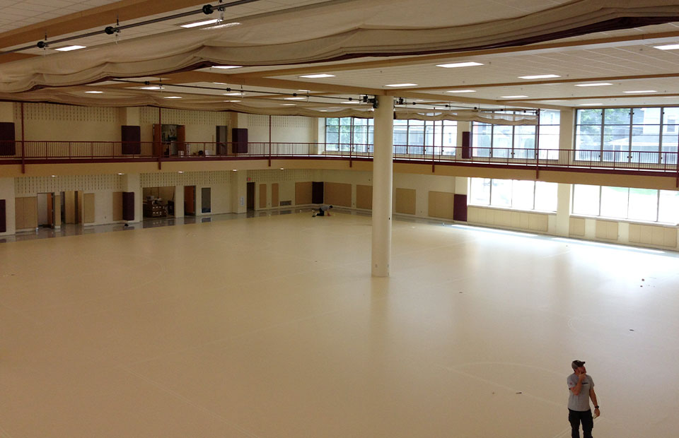 This new gymnasium building boasts three full size basketball courts, five volleyball courts and a second level walking/jogging track that overlooks the gym. The Student Co-op owns the first two levels of the building while the three floors above the facility were built as student housing by a private developer.