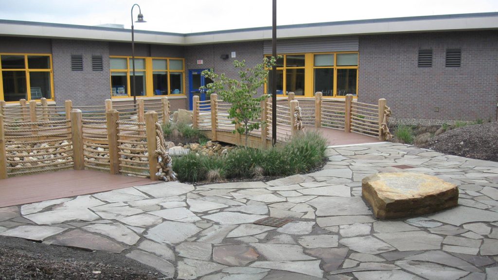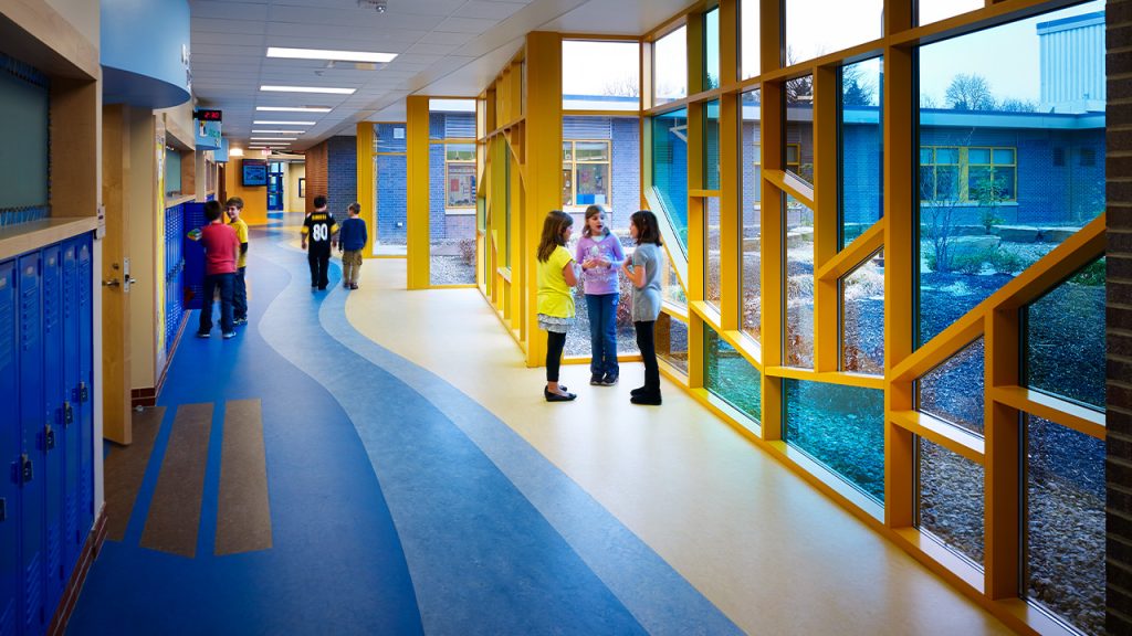Ross Elementary is a modernized facility centered on an aquatic themed interior. The hallways flow with ocean waves and the exterior courtyards boast water gardens and rock seating for an open air approach to teaching.